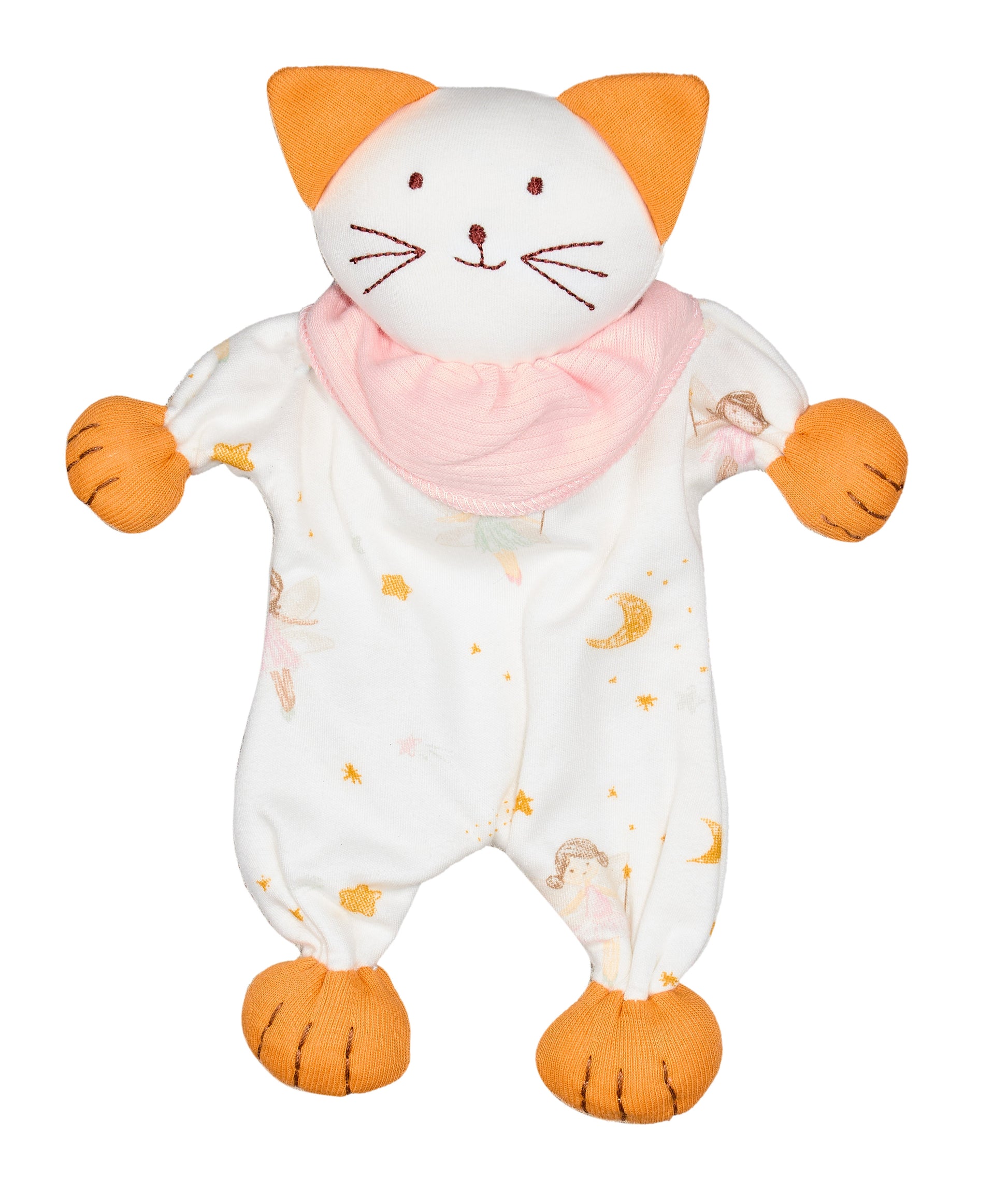 This sweet kitty lovey toy will quickly become a cherished friend for your little one. Perfectly sized for tiny hands to grasp and snuggle, its soft, flat design makes it an ideal companion for playtime and naptime alike. The head, paws, and feet are gently stuffed with pure organic cotton, offering delightful textures for curious fingers to explore.